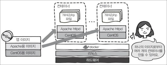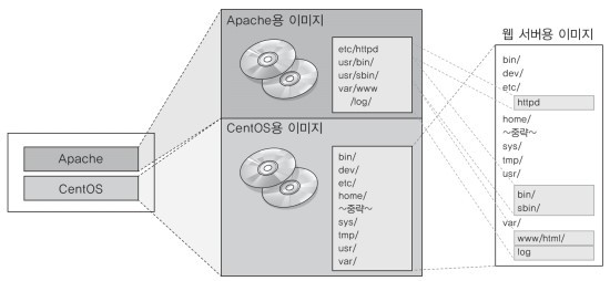 또한 Docker 이미지는 겹쳐서 사용할 수 있다. 예를 들어 OS용 이미지에 웹 애플리케이션용 이미지를 겹쳐서 다른 새로운 이미지를 만들 수 있다. Docker에서는 구성에 변경이 있었던 부분을 차분(이미지레이어)로 관리한다.(해당 부분은 자세히 조금 더 깊게 공부하고 다루도록 하겠다.) 또한 애플리케이션의 실행에 필요한 파일은 크기가 큰 경우도 있으므로 효율이 좋은 이미지를 만들 필요가 있다.