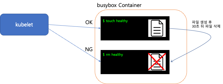 - touch /tmp/healthy; sleep 30; rm -rf /tmp/healthy; sleep 600 # /tmp/healthy 파일 생성 후 30초 뒤 삭제