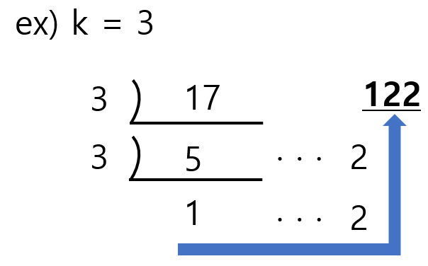 입력 값 n이 0보다 큰 값을 가지는 동안 n을 k로 나눈 나머지를 ret에 저장하고, n은 k로 나누어줍니다(나머지는 버림)