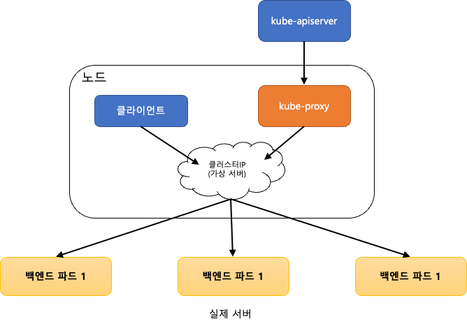 클라이언트에서 서비스의 클러스터 IP를 통해 어떤 요청을 하면 iptables를 거쳐서 kube-proxy가 요청을 받습니다. 그리고 서비스의 클러스터 IP는 연결되어야 하는 적절한 파드로 연결해줍니다. 이 때 요청을 파드들에게 나눠줄 때는 라운드 로빈(round robin) 방식을 사용합니다.