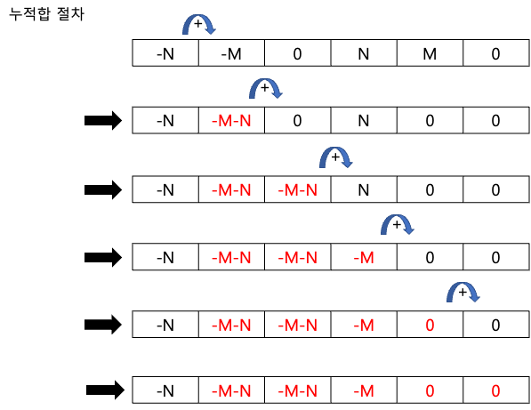 위의 배열을 누적합하는 절차는 다음과 같습니다.