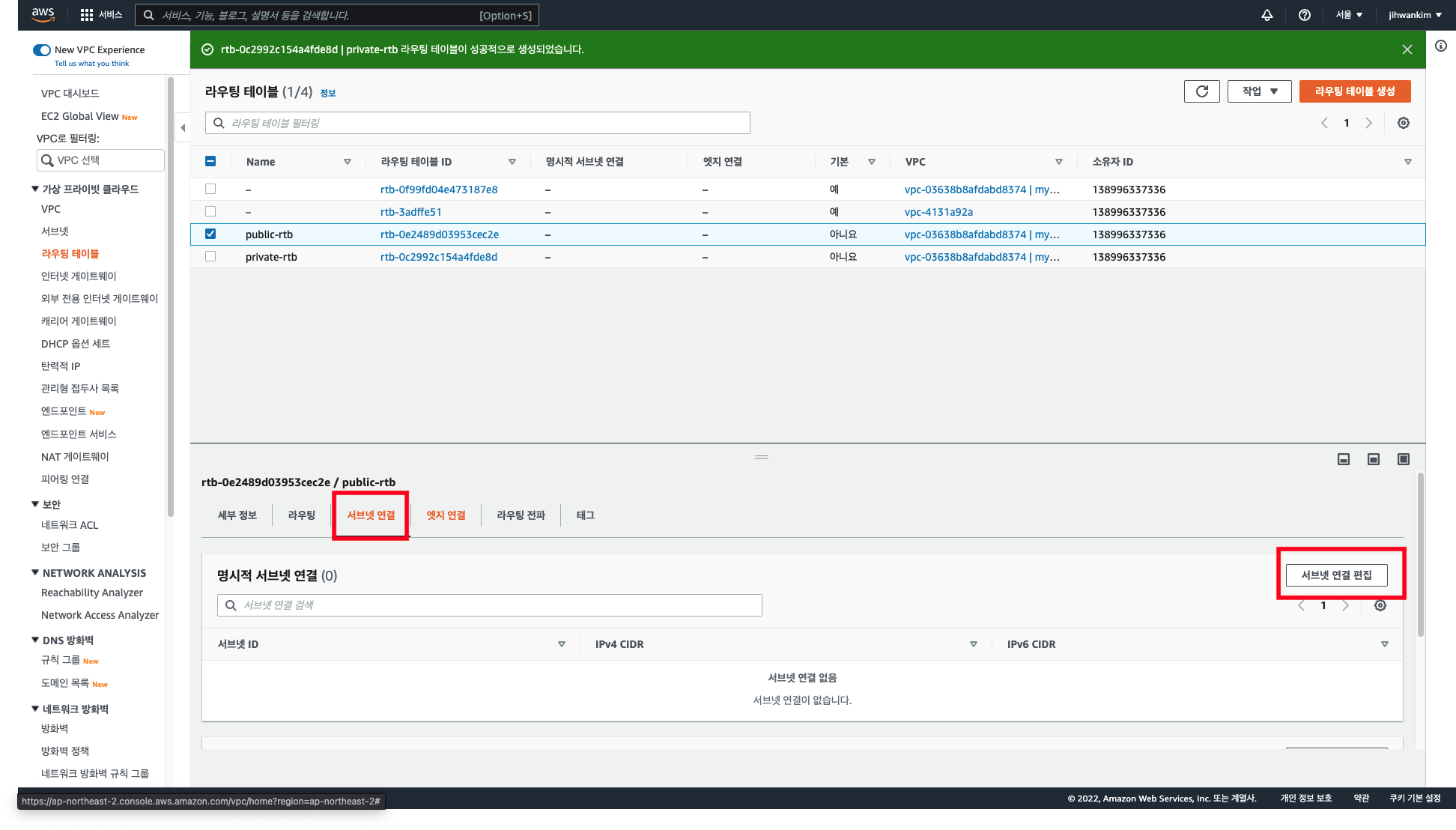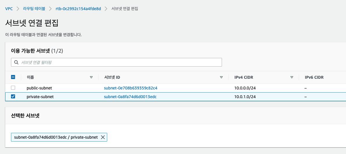 그리고 public-rtb는 public subnet과 private-rtb는 private subnet과 연결합니다. (각각 설정ㅇ)