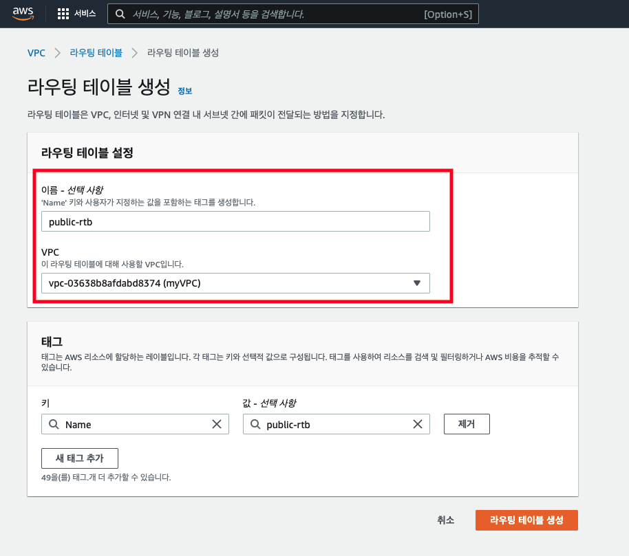 이름을 public-rtb, private-rtb로 두 개의 라우팅 테이블을 생성하겠습니다.