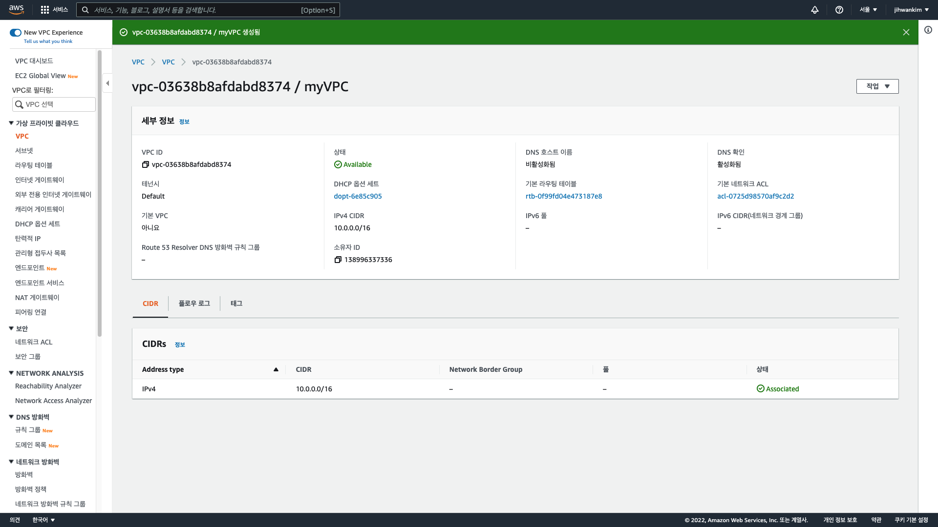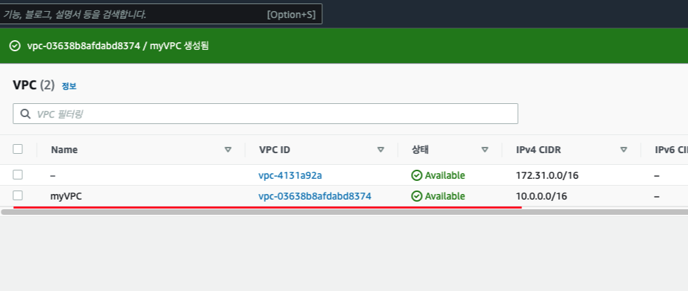 다시 VPC 콘솔로 돌아가면 VPC가 생성된 것을 확인할 수 있습니다.
