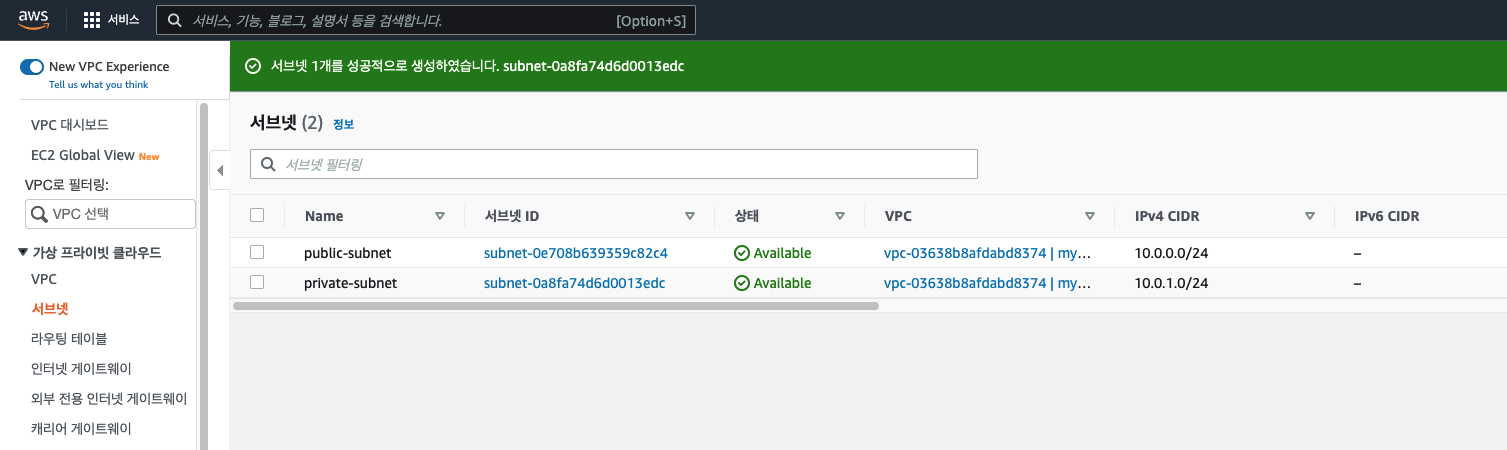 public-subnet(10.0.0.0/24)이라는 이름의 서브넷과 private-subnet이라는 이름의 서브넷 두 개를 생성하도록하겠습니다.
