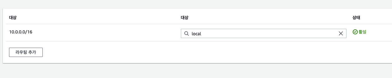 위의 라우팅 테이블을 설명하면 다음과 같습니다. 목적지가 10.0.0.0/16인 ip는 로컬에서 찾아서 전송하고, 그 이외의 ip는 인터넷 게이트웨이로 전송하라.