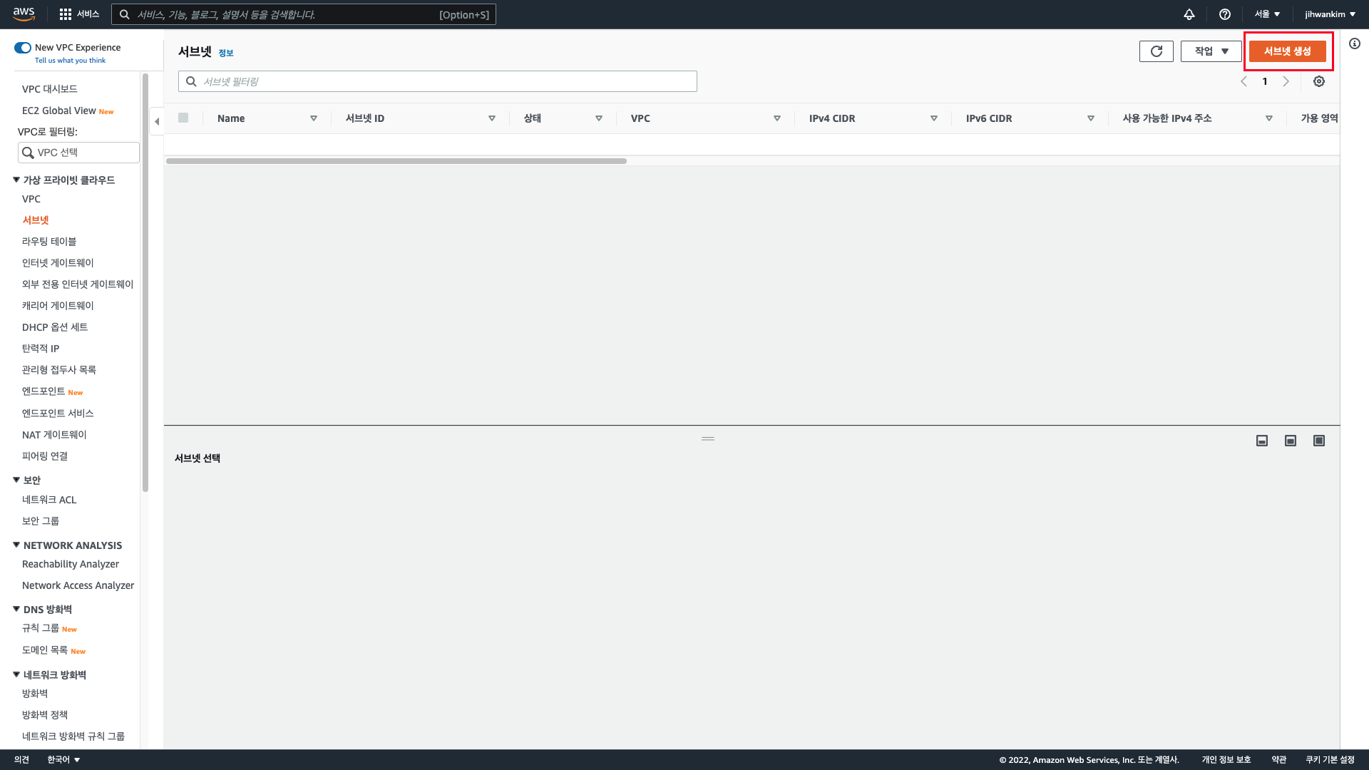Management Console에서 서브넷 페이지로 접속하여 "서브넷 생성" 버튼을 클릭해서 서브넷을 생성할 수 있습니다.