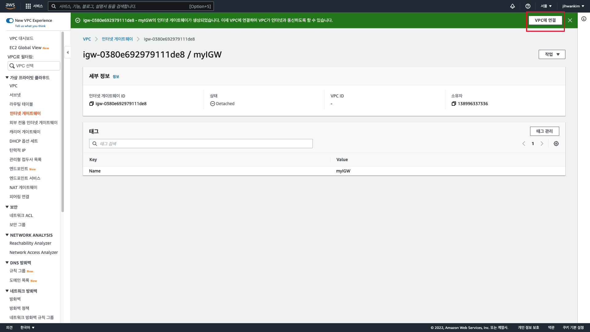 생성한 VPC의 이름을 선택한 후 인터넷 게이트웨이에 연결 버튼을 클릭합니다.