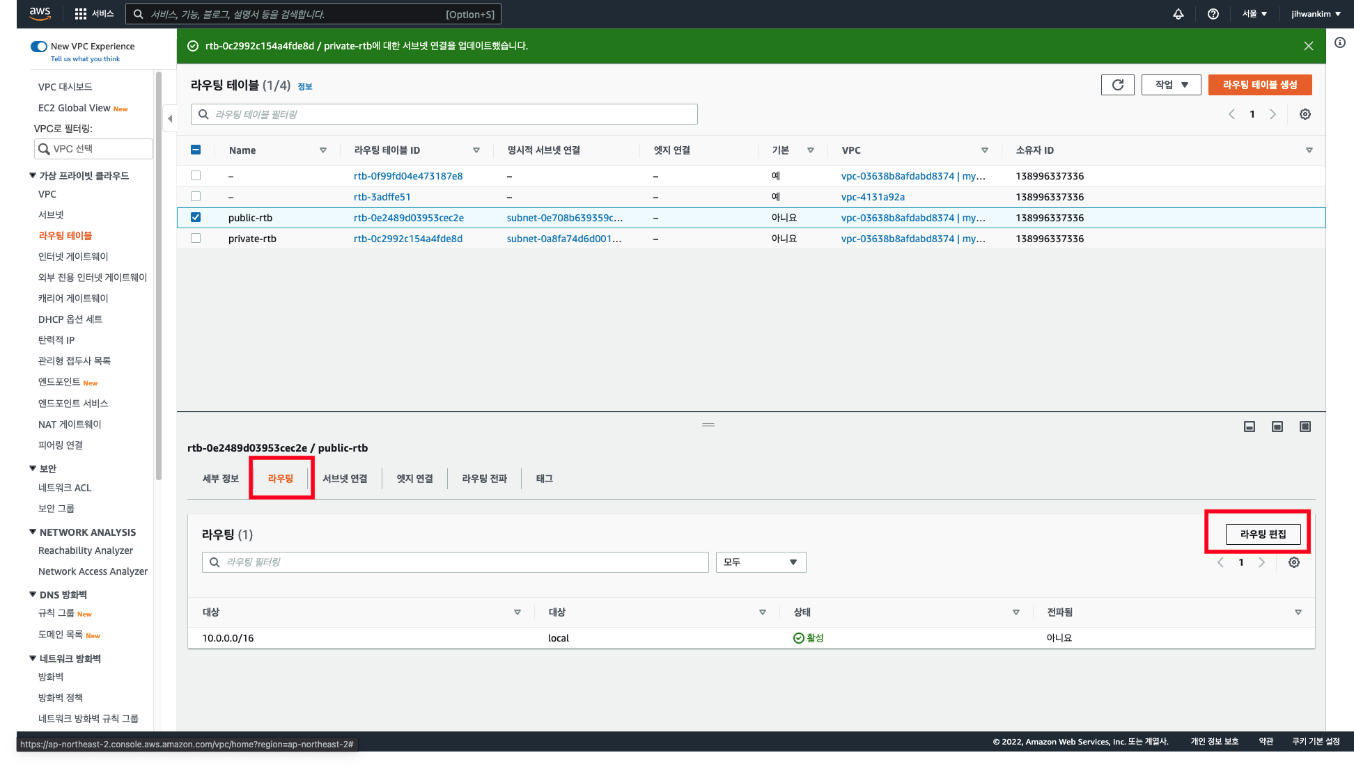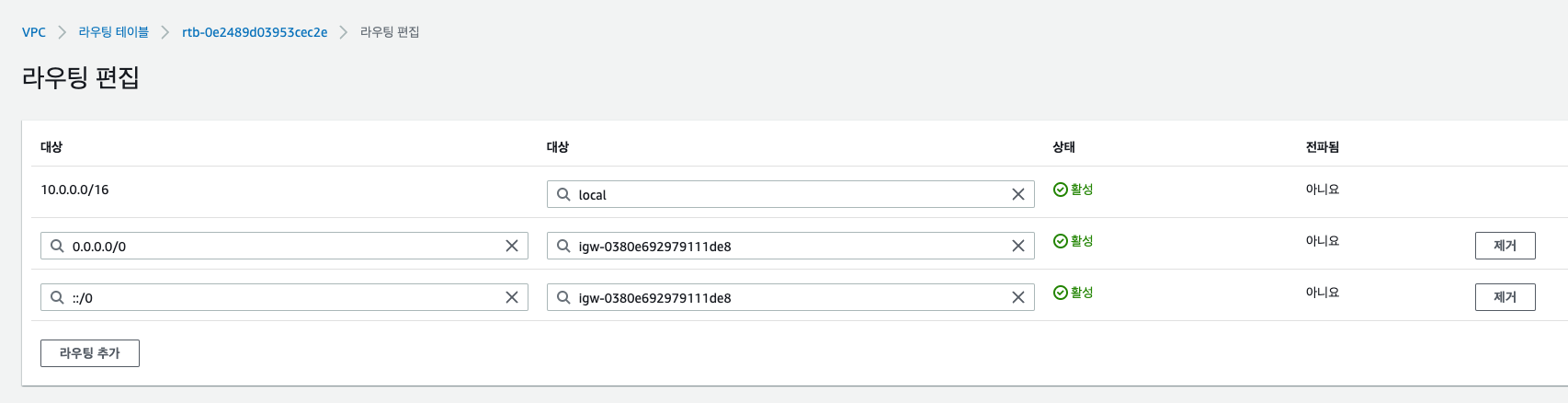 마지막으로 라우팅 테이블의 라우팅 규칙을 설정합니다. 각 라우팅 테이블을 클릭한 후 '라우팅' > '라우팅 편집'을 클릭하여 라우팅 규칙을 편집할 수 있습니다.