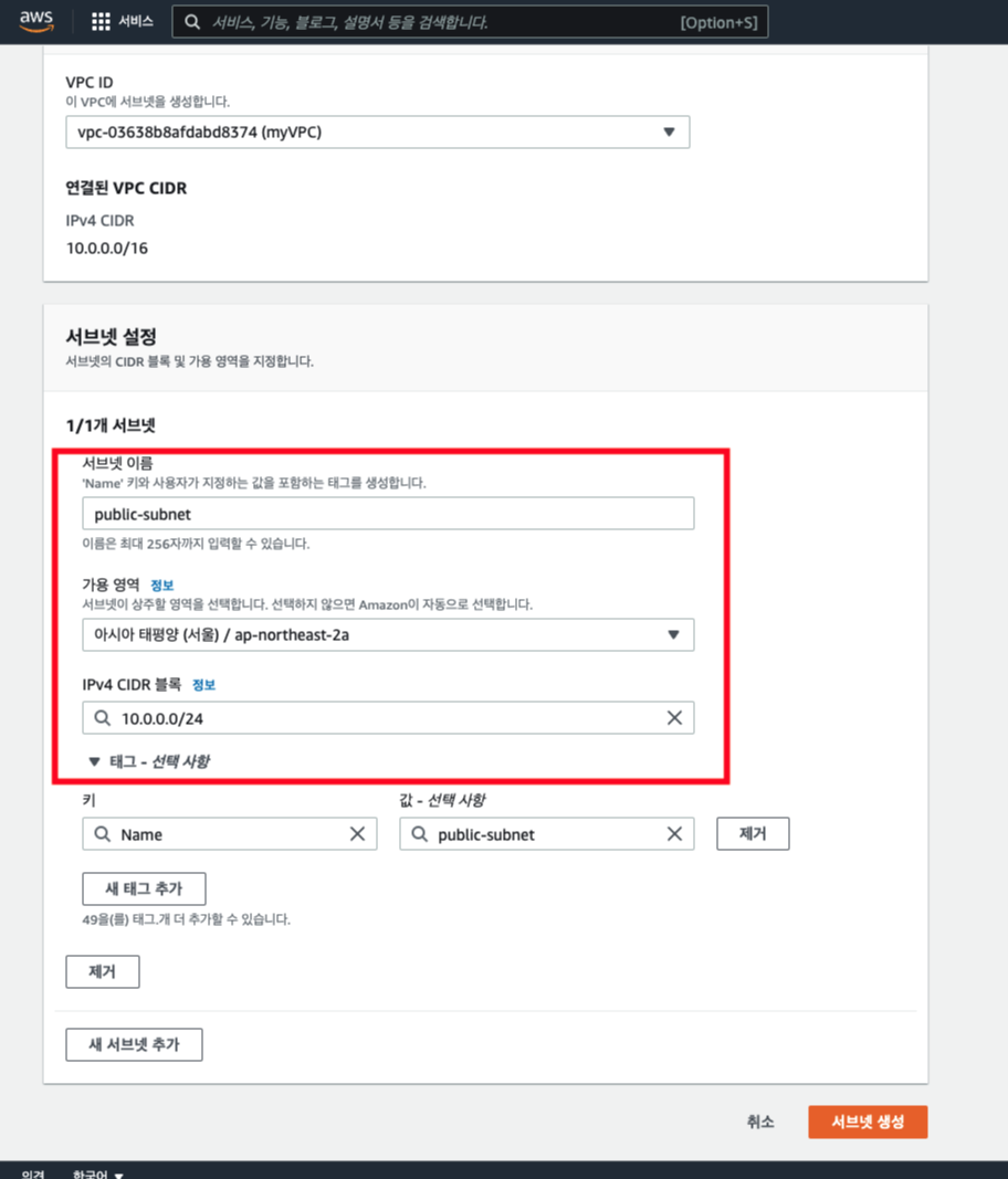 서브넷의 이름과 가용 영역(AZ), CIDR 를 적절하게 입력합니다. (서브넷 내에도 CIDR를 지정해주어야 합니다.)