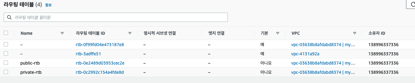 여기서도 VPC를 위에서 생성한 VPC로 선택합니다. 라우팅 테이블을 정상적으로 생성하였으면 다음과 같습니다.