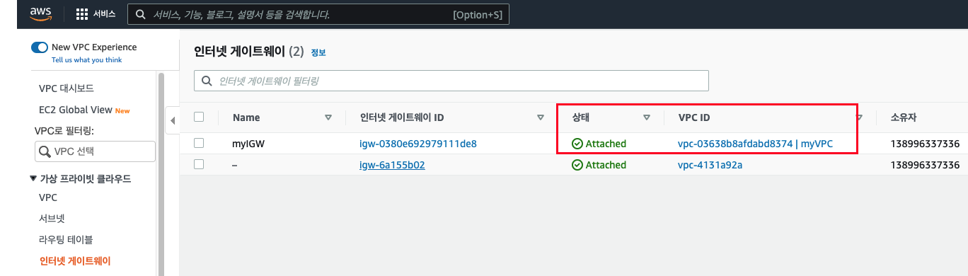이후 콘솔에서 인터넷 게이트웨이와 VPC가 연결된 것을 확인할 수 있습니다.