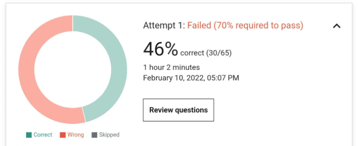 Udemy에서 풀듯이 그냥 체크하는 형식으로 문제를 풉니다. 한국어로 응시하였지만 영어 지문을 볼 수 있습니다. 번역이 완벽하지 않아서, 오히려 영어 지문을 보고 푼 문제도 많았습니다. 전체 문제를 총 두 번 풀었는데, 65번 문제에서 1번 문제로 갈 수 있는 버튼이 없어서(혹은 못 찾아서) 64번의 클릭으로 다시 1번으로 돌아가서 다시 문제를 풀었습니다.