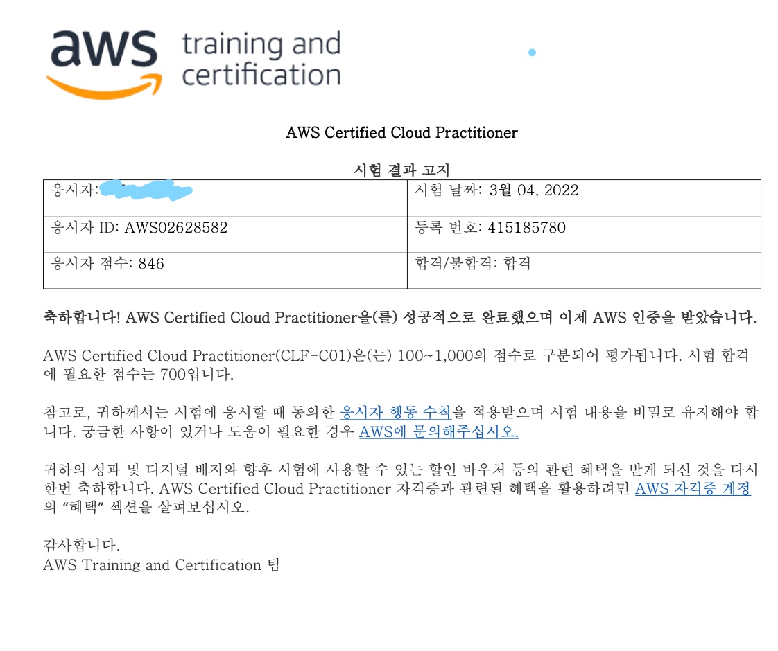 이번 포스팅은 AWS Certified Cloud Practitioner 자격증 취득 후기로 자격증 공부 방법 및 시험 응시 과정에 대한 내용만 다루도록 하겠습니다. 자격증에 대한 기본적인 내용(응시 방법, 응시 대상, 시험 신청 등등..)은 다루지 않습니다.