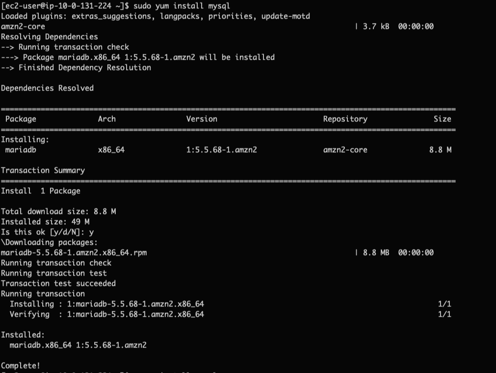 설정 후에는 yum을 통해 mysql이 다운로드 되는 것을 확인할 수 있습니다.