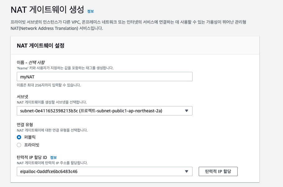 NAT 게이트웨이 생성 버튼을 통해 NAT 게이트웨이를 생성합니다. 구성 설정 정보는 다음과 같습니다.