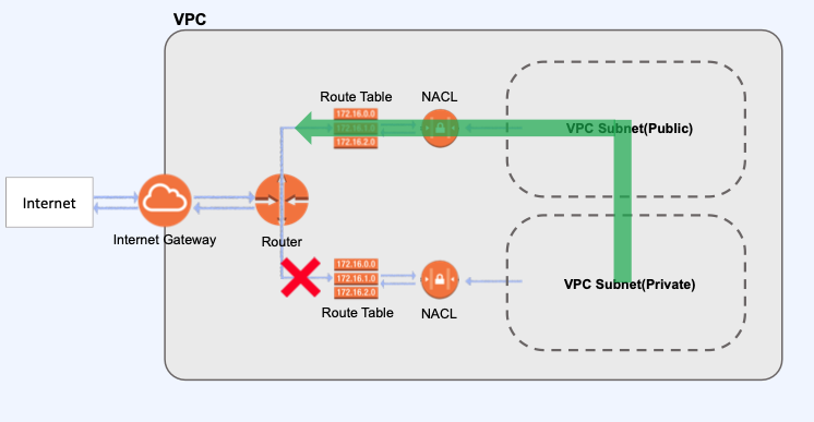 통신 과정을 그림으로 나타내면 다음과 같습니다. Private Subnet에서 Public Subnet에 존재하는 NAT를 통해 외부 인터넷으로 연결된 것입니다.