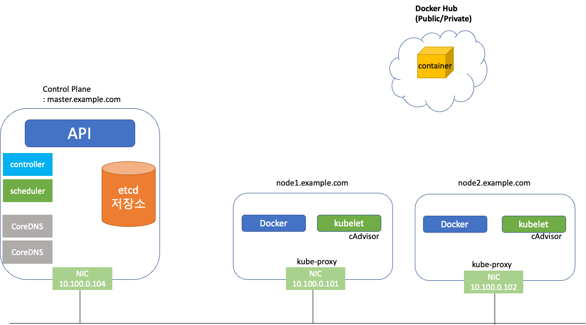 | etcd | - key-value 타입의 저장소 - 쿠버네티스 마스터 및 노드들의 다양한 상태 정보 저장 |