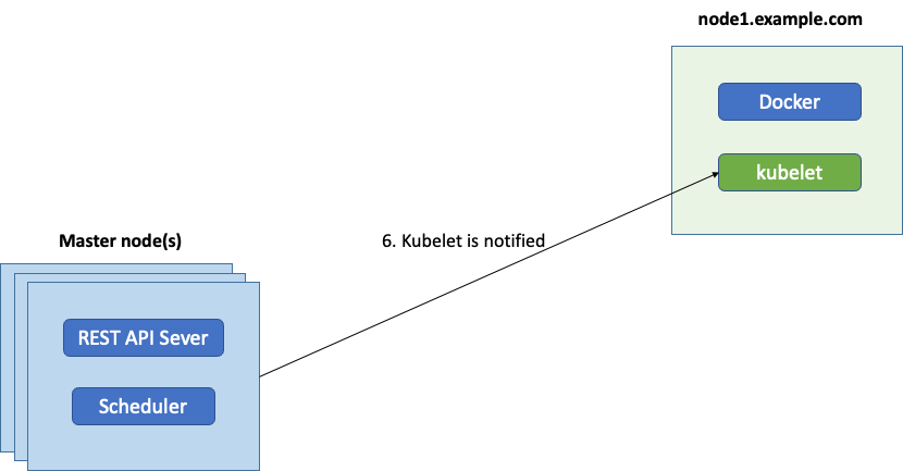 Scheduler가 Pod를 생성하기 적당한 노드를 찾아 해당 노드의 kubelet에 파드 생성 요청을 합니다.