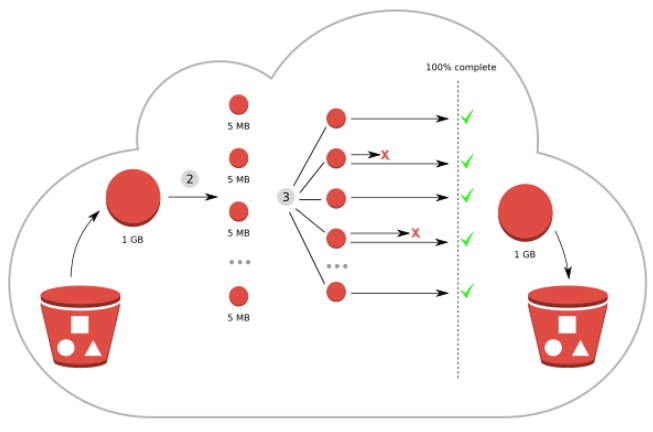 이와 같은 용량 제한 문제를 피하기 위한 방법으로, AWS는 100MB 초과 객체의 경우 멀티파트 업로드(Multipart Upload) 기능을 사용할 것을 권장한다.