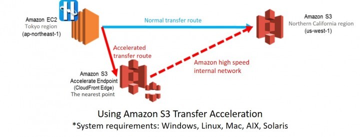 Transfer Accleration이 소속된 지역과 특정 AWS 리전 사이에서 실제로 얼마나 빠른 속도로 파일을 전송하는지 확인하려면 Amazon S3 Transfer Accleration Speed Comparison 도구를 이용합니다.