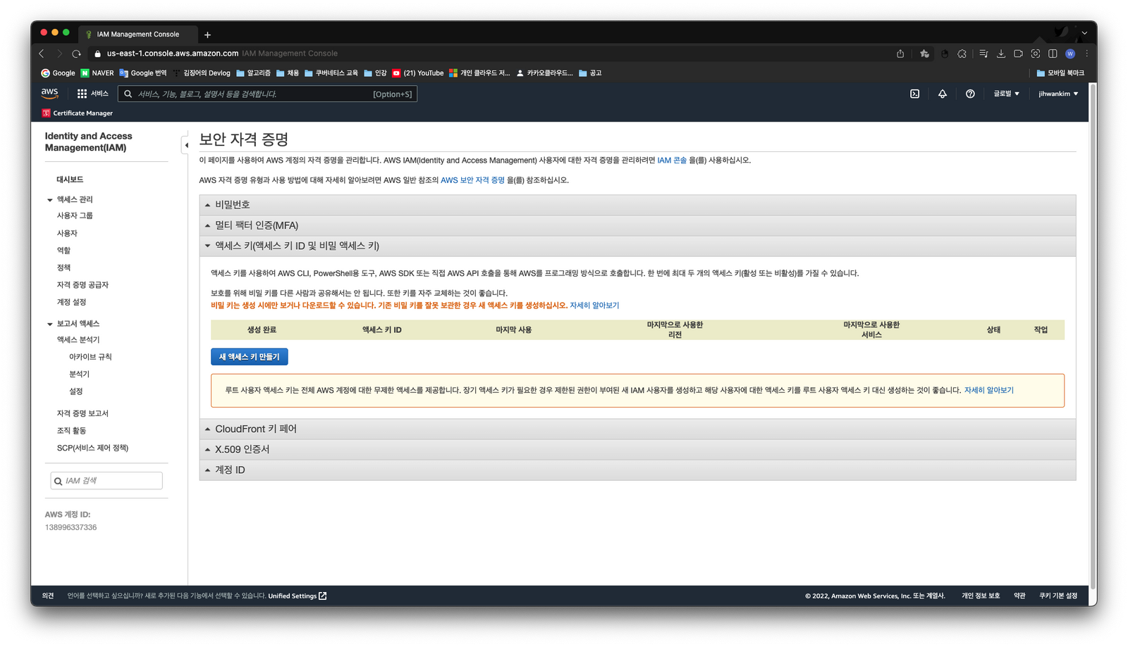 실습에서는 간단하게 root 계정으로 발급을 하였지만, 실무에서는 상황에 맞게 IAM 계정을 생성하여 해당 IAM 계정에 대한 액세스 키를 발급하여야 합니다. (root 계정으로는 모든 동작이 가능하므로 해킹을 당하는 경우 위험합니다.)