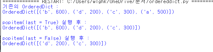 예제 실행결과를 살펴보면 popitem(last = True)를 실행하였을 때 가장 마지막에 삽입된 { 'a' : 500 } 아이템이 삭제 되었으며, popitem(last = False)인 경우 가장 먼저 삽입된 { 'b' : 600 } 아이템이 삭제된 것을 볼 수 있다.