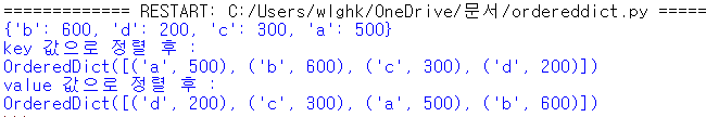 - OrderedDict를 이용하면 기존 ㄴDict type의 값을, value 또는 key 값으로 정렬할 때 사용할 수 있다.