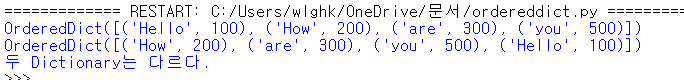 출력형태는 비슷하지만 비교 결과가 다르게 나온다. 왜냐하면 OrderedDict의 경우에는 순서까지도 저장되기 때문에 순서 또한 비교 대상으로 포함이 되기 때문이다.