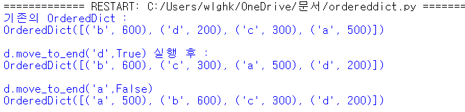 d.move_to_end('a',False) 를 실행하였을 때 { 'a' : 500 } 이 맨 앞으로 이동한 것을 확인할 수 있다.