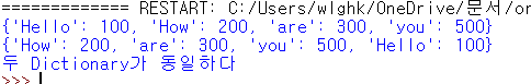 두 Dictionary의 입력 순서를 다르게 해주어서 결과출력이 d, v가 다름에도 비교식은 같다고 판단한다,