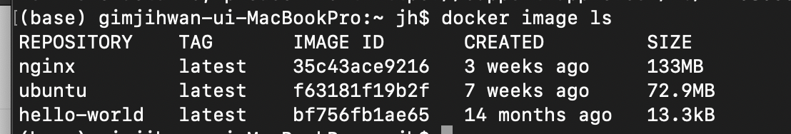 Docker 에서 다운받은 이미지 목록을 표시할 땐 다음과 같이 명령어를 사용한다.